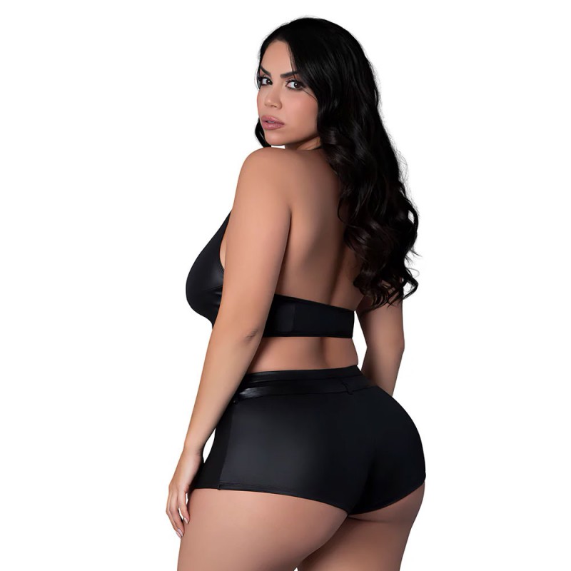 Make a bold statement with the Lust Thalia set from the Lust Fetish collection. Crafted from sleek, stretch fabric with a faux leather lingerie look, this daring ensemble features a play top with striking cutouts, secured with straps and mini belt buckles for an edgy aesthetic. The halter-style neckline adds a touch of sophistication, while the hot shorts provide full coverage with a comfortable fit. A detachable buckled belt offers versatility, and nickel-plated studs, rings, and buckles complete the bold design. A must-have for any fetish-inspired collection.