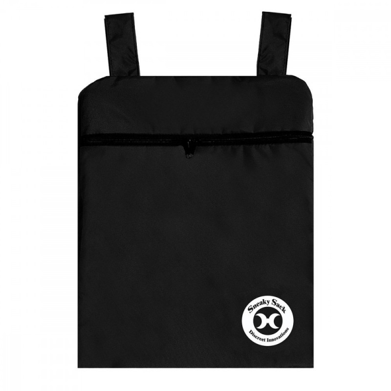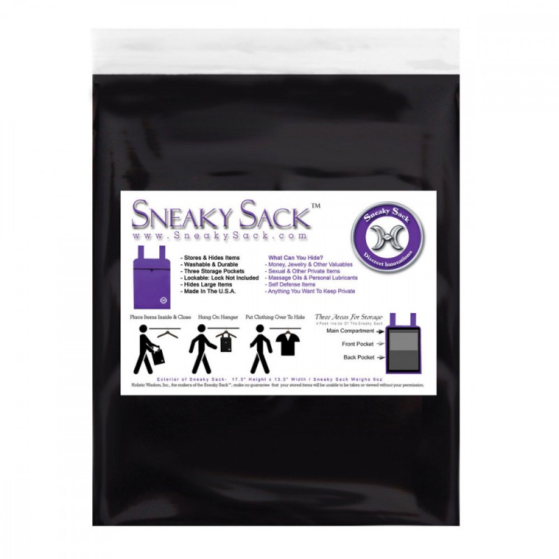 The best way to store the Sneaky Sack™ is to place it on a hanger and to store it discreetly under some clothing such as a sweatshirt or coat. This bag is designed to hang below necklines of clothing and disappear from view. A dark sweater, coat or sweatshirt is best for the most discreet placement.