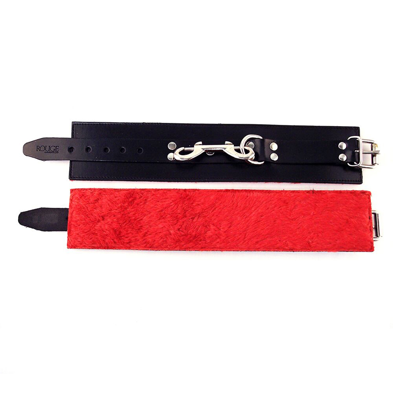 Hand crafted leather and fur-lined ankle cuffs are securely fastened by buckle straps and connected by a strong double ended hook. Features double layered premium quality leather. With black strap and red fur lining.