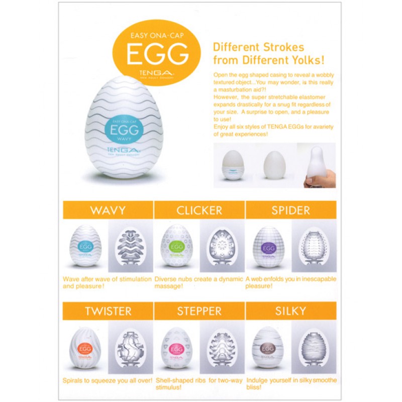 Tenga EGGs are not just masturbation holes, but masterpieces of pleasure! Disposable, discreet travel companions. Stretches and moves as you please, creating a variety of sensations! Within the outer plastic egg shell you will discover a soft and flexible rubber sleeve containing a sachet of personal lubricant to heighten the enjoyment and pleasure while bringing the experience closer to the satisfaction of intercourse. These egg-shaped masturbation sleeves offer six unique internal textures.