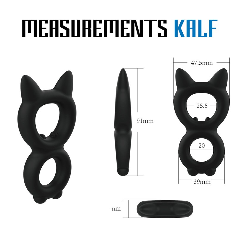 ROOSTER KALF is a soft silicone double ring cock ring, reminiscent of a cat. It is designed so that the big ring enrings the whole package (penis and scrotum), while the small ring enrings the base of the erect penis. You can wear this cock ring with the small ring close to the body making the big ring pull balls forward. Alternatively, you can wear the big ring close to your body so the small ring will then hold the penis up more. Either way of wearing ROOSTER KALF is comfortable and results in a prominent bulge and a veiny erect penis.