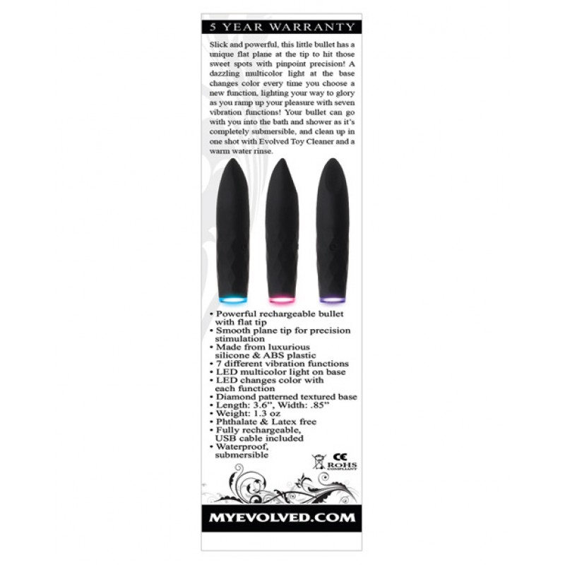 Slick and powerful, this little bullet has a unique flat plane at the tip to hit those sweet spots with pinpoint precision! A dazzling multi-color light at the base changes color every time you choose a new function, lighting your way to glory as you ramp up your pleasure with seven vibration functions! Your bullet can go with you into the bath and shower as it’s completely submersible, and clean-up is a breeze.