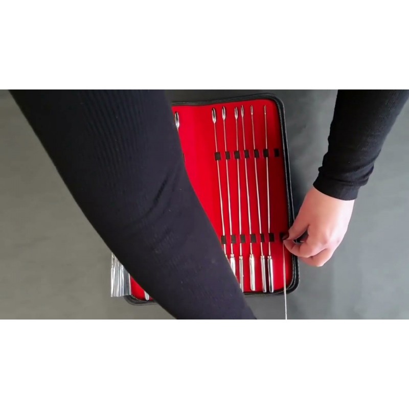 This 12 piece Rosebud Urethral Sound kit is perfect for beginners. Each sound gradually increases in diameter and has a smooth tip for easy insertion. Start with a 0.1mm tip and work your way up to a 120mm tip. Made from surgical grade Stainless Steel, easy to clean and lubricant safe. The Rosebud Sounds – Hegar Dilator Set comes in a leather, velvet lined case.