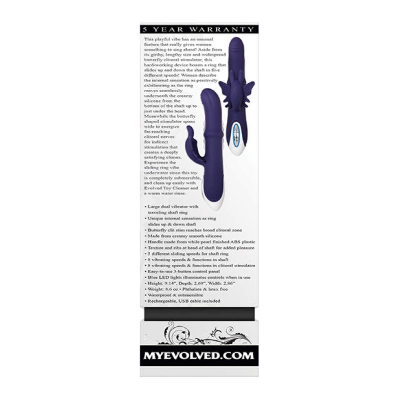 This playful vibe has an unusual feature that really gives women something to sing about! Aside from its girthy, lengthy size and widespread butterfly clitoral stimulator, this hard-working device boasts s ring that slides up and down the shaft at five different speeds! Women describe the internal sensation as positively exhilarating as the ring moves seamlessly underneath the creamy silicone from the bottom of the shaft up to just under the head. Meanwhile, the butterfly-shaped stimulator spans wide to energize far-reaching clitoral nerves for indirect stimulation that creates a deeply satisfying climax. Experience the sliding ring vibe underwater since this toy is completely subversive, and clean-up is easy with toy cleaner or soap and a warm water rinse.
